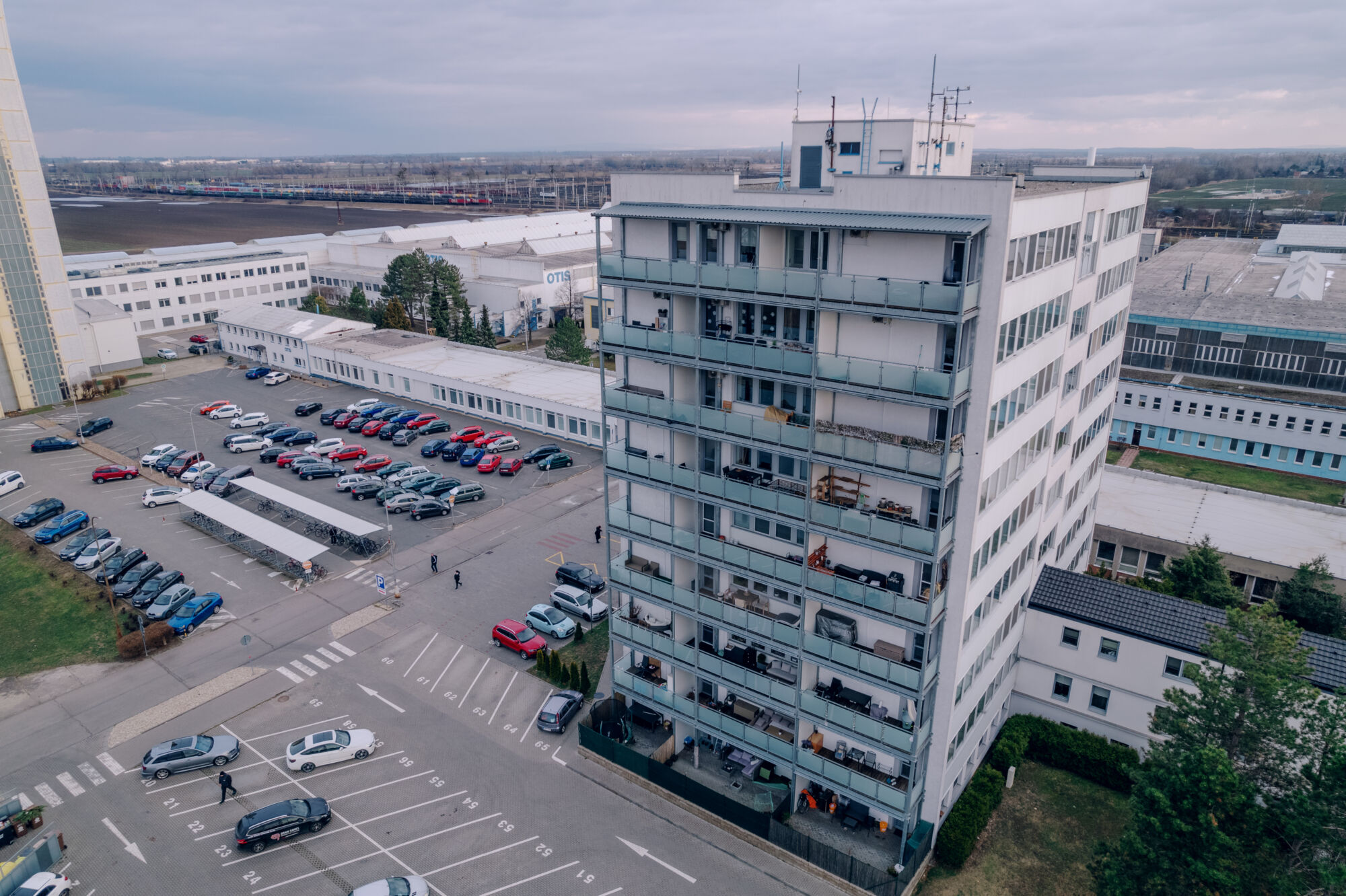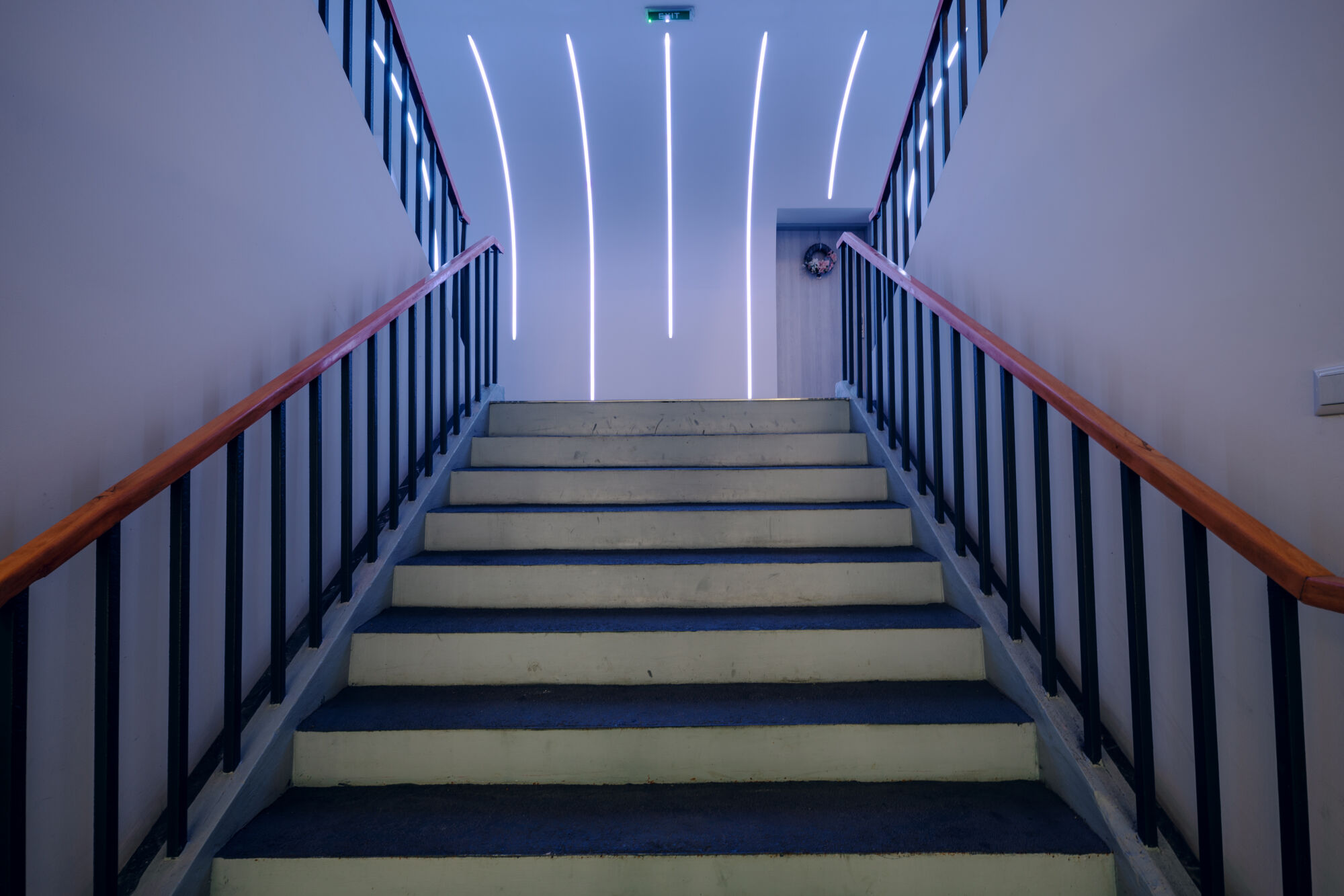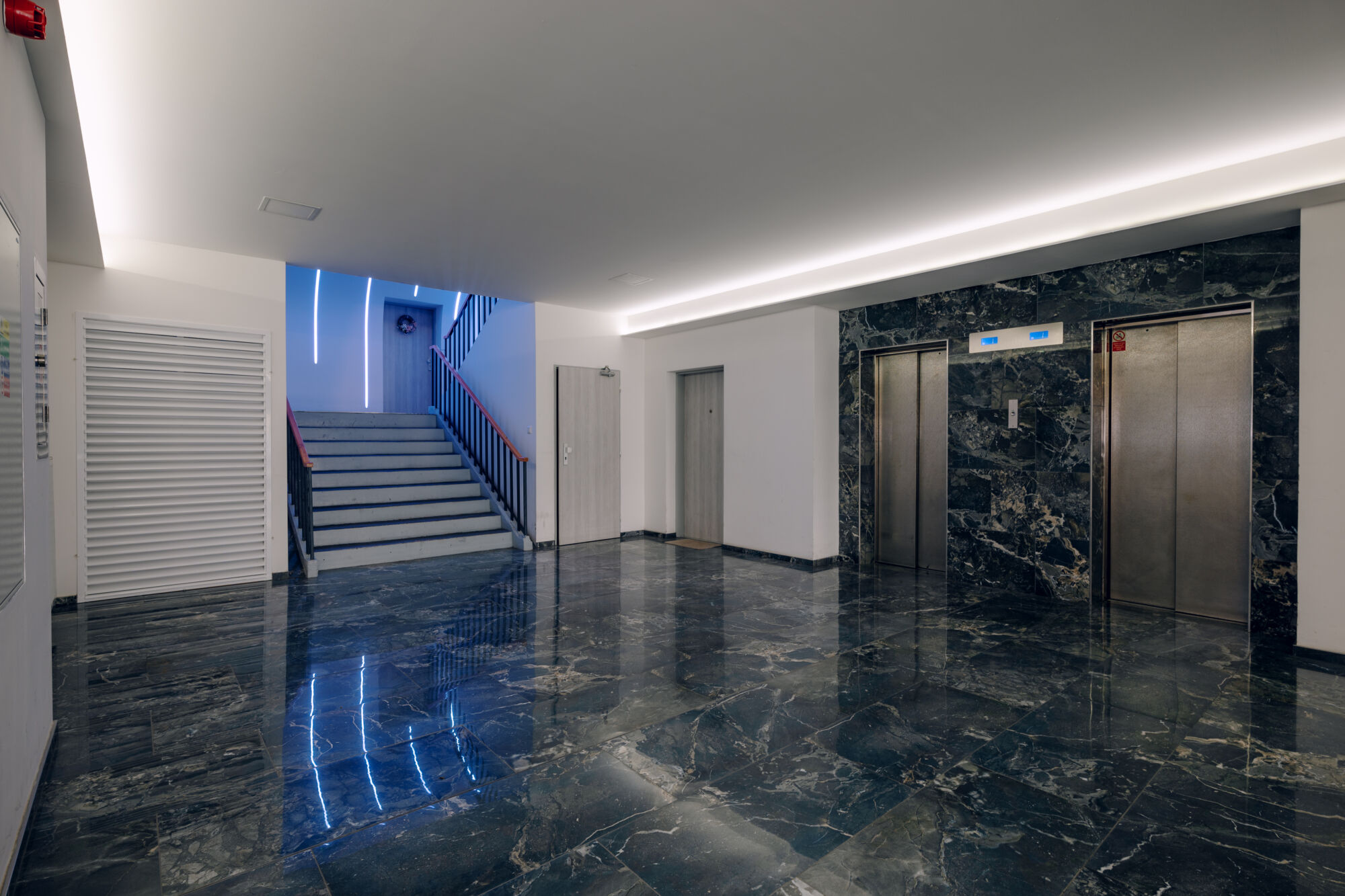 Bytová jednotka je umístěna ve 7. podlaží bytového domu a je plně bezbariérová. Po vstupu do domu vás čeká velkorysé lobby. Ve všech společných prostorách je kladen důraz na světlo, které zajišťují rozměrná okna na podestách schodišť. Celý dům je také obsluhován dvěma výtahy.