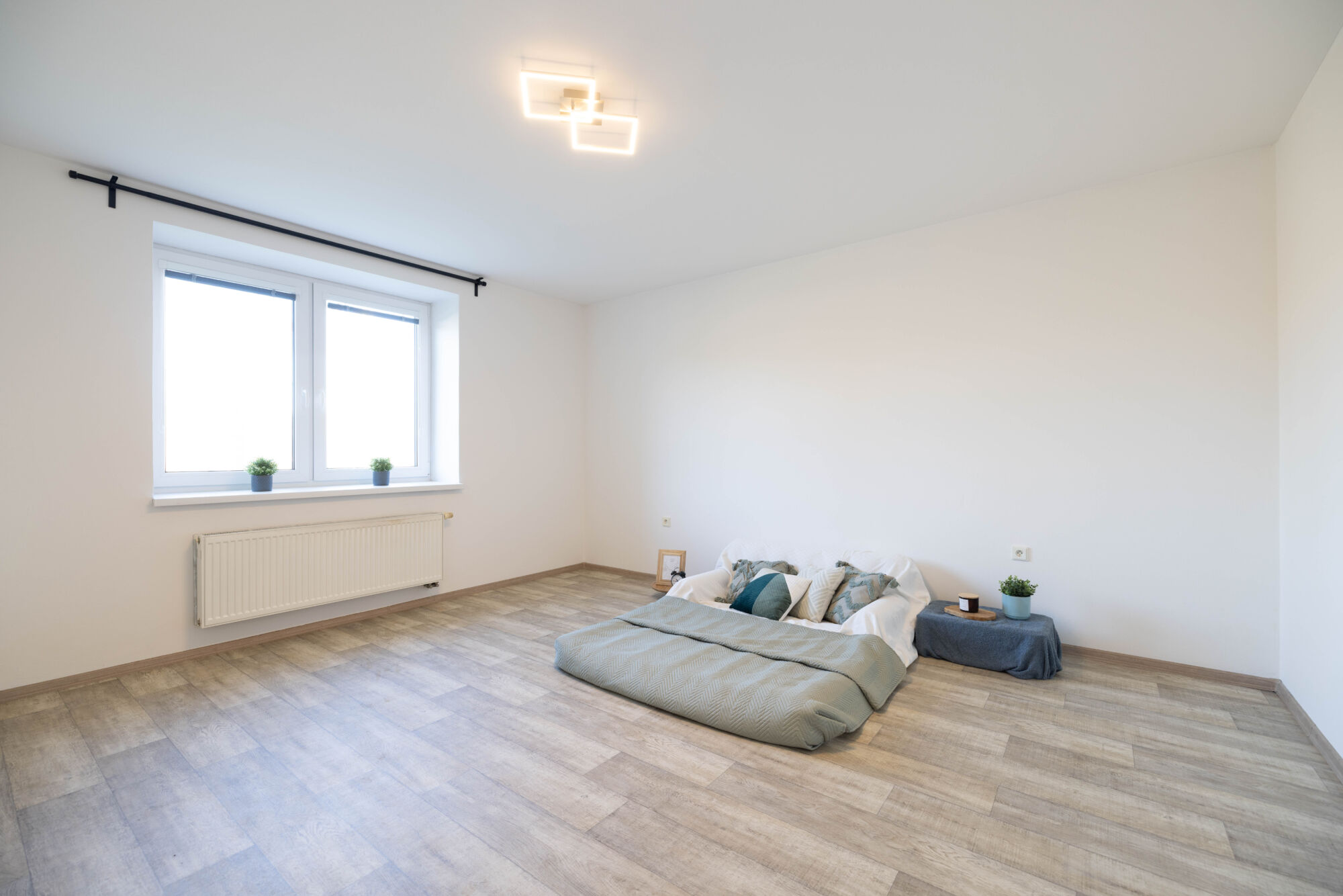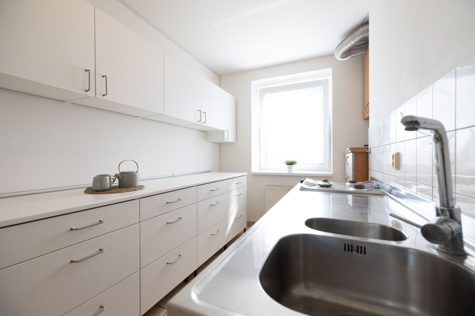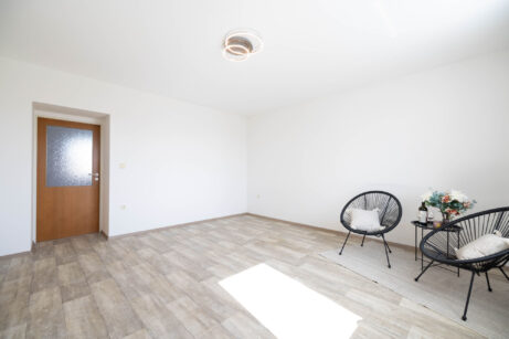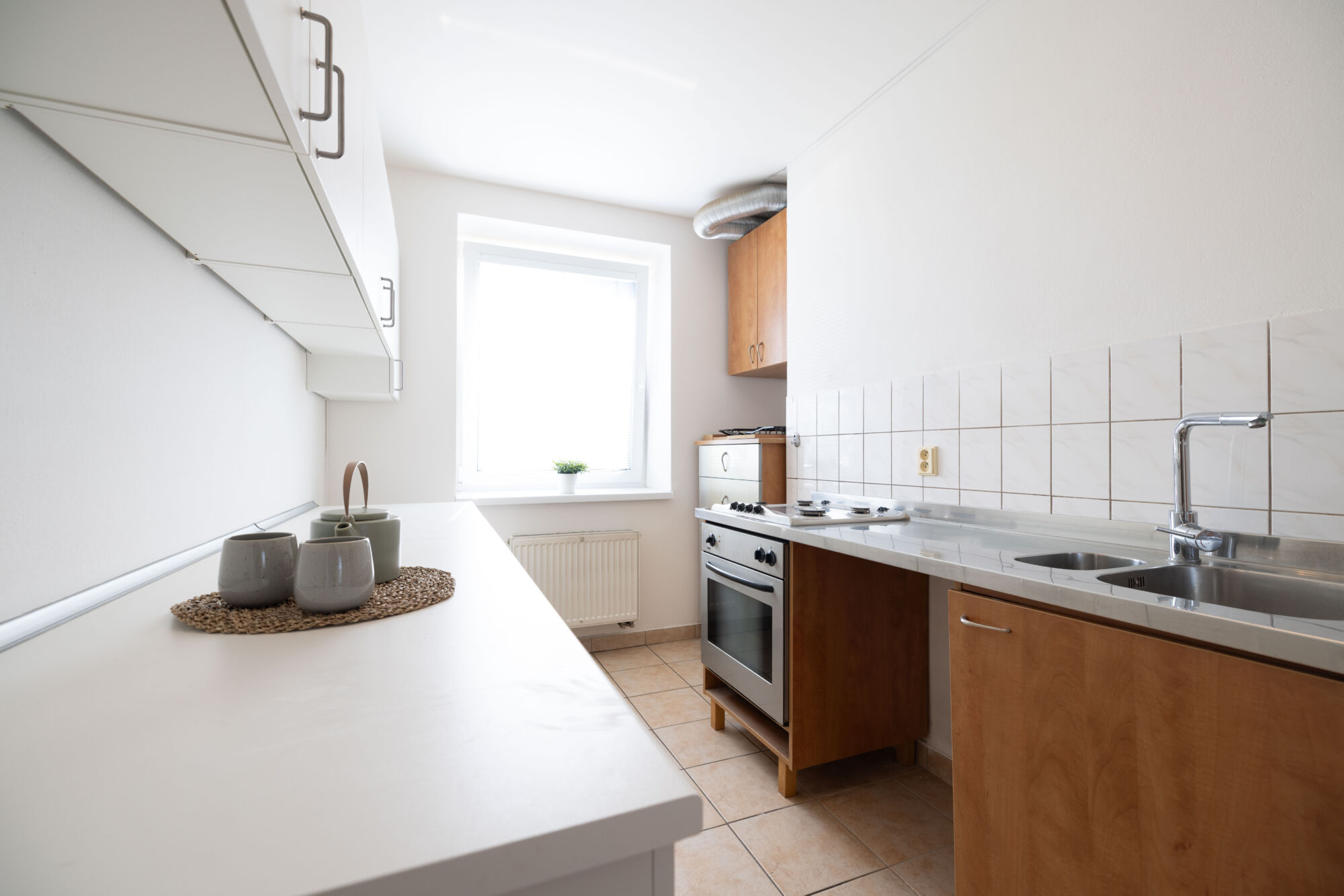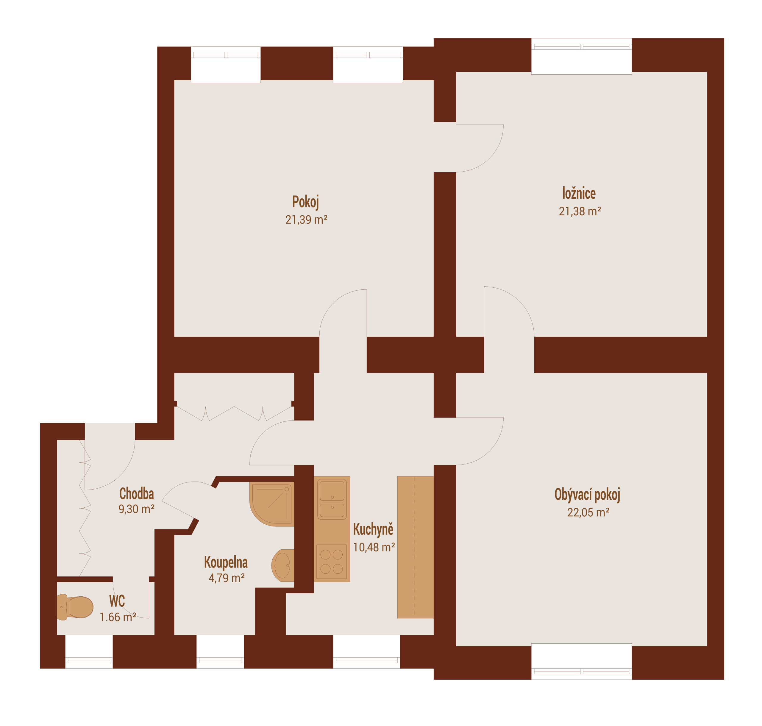 Interiér je promyšleně rozdělen na společenskou část s obývacím pokojem a samostatnou kuchyní, zatímco dvě neprůchozí ložnice orientované na severozápad zajišťují nerušený klid a příjemné klima pro spánek.