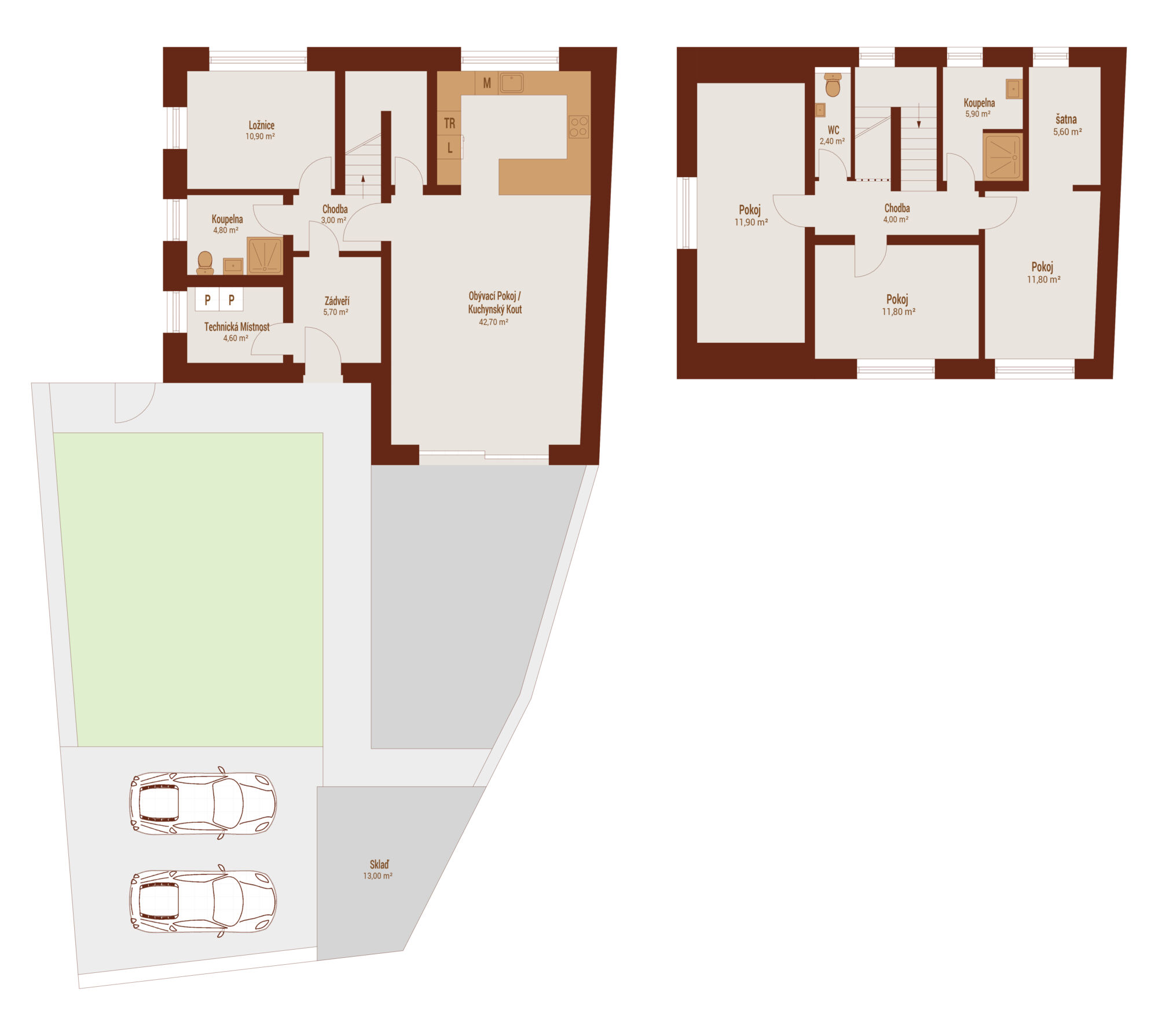 Při příjezdu k domu je pro vás připraveno vydlážděné parkovací stání pro dvě auta a zděný zahradní sklad.