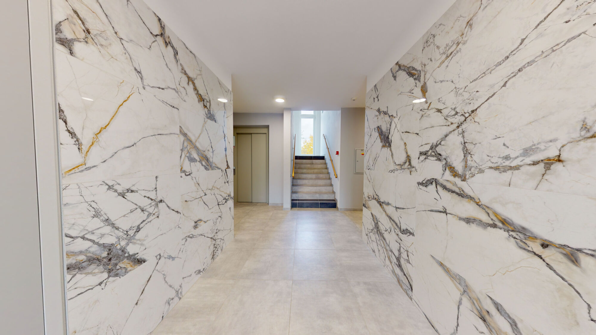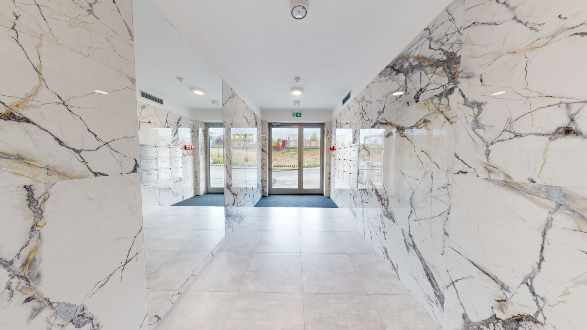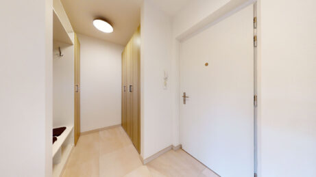 Po vstupu do bytu se ocitnete v prostorné chodbě, která propojuje celý byt, nabízí praktickou šatnu s vestavěnými skříněmi a také vstup do koupelny a obytného prostoru.