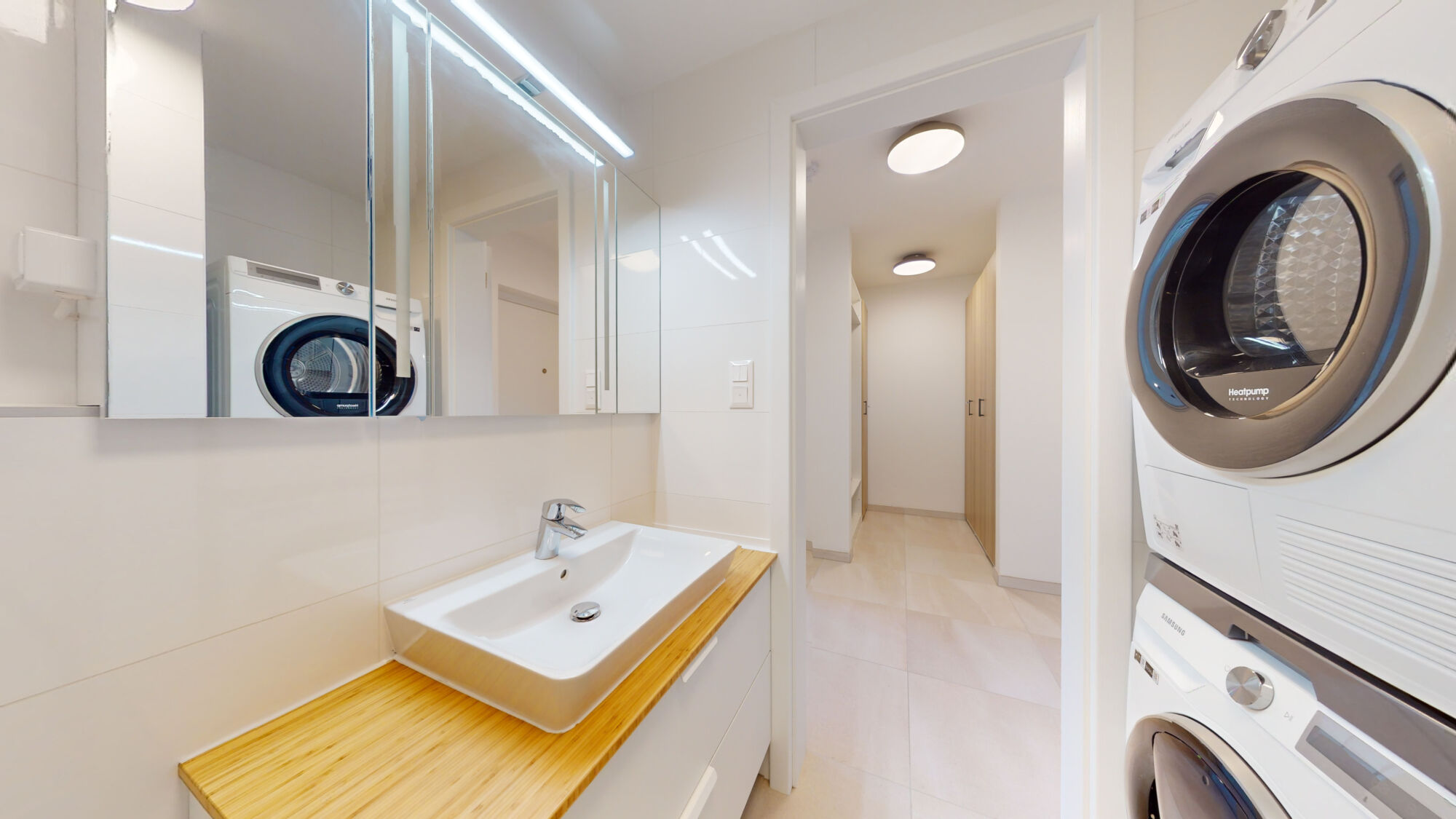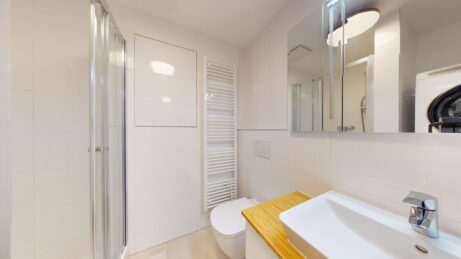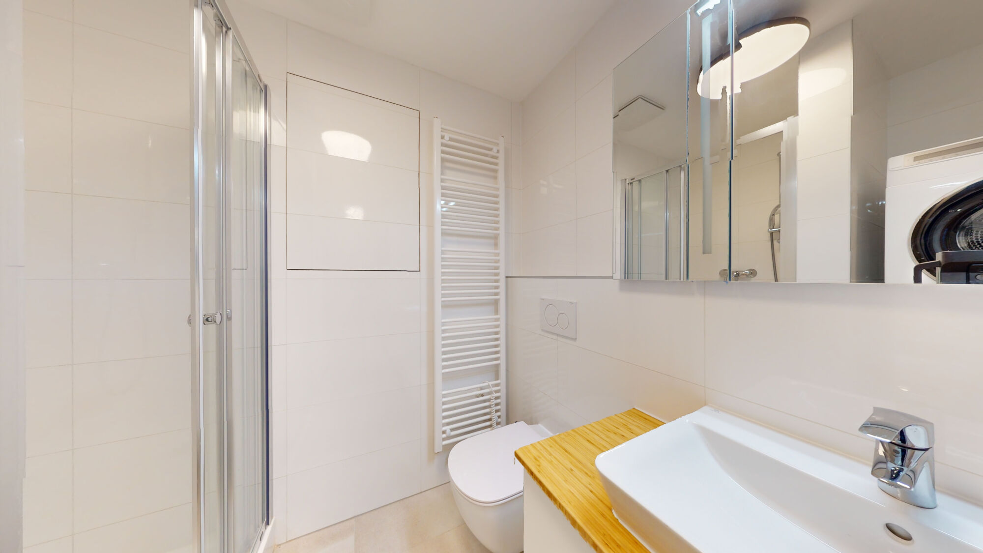 Pěkná koupelna se sprchovým koutem, umyvadlem a toaletou. Součástí pronájmu jsou také nadtandardní spotřebiče Samsung - pračka a sušička.