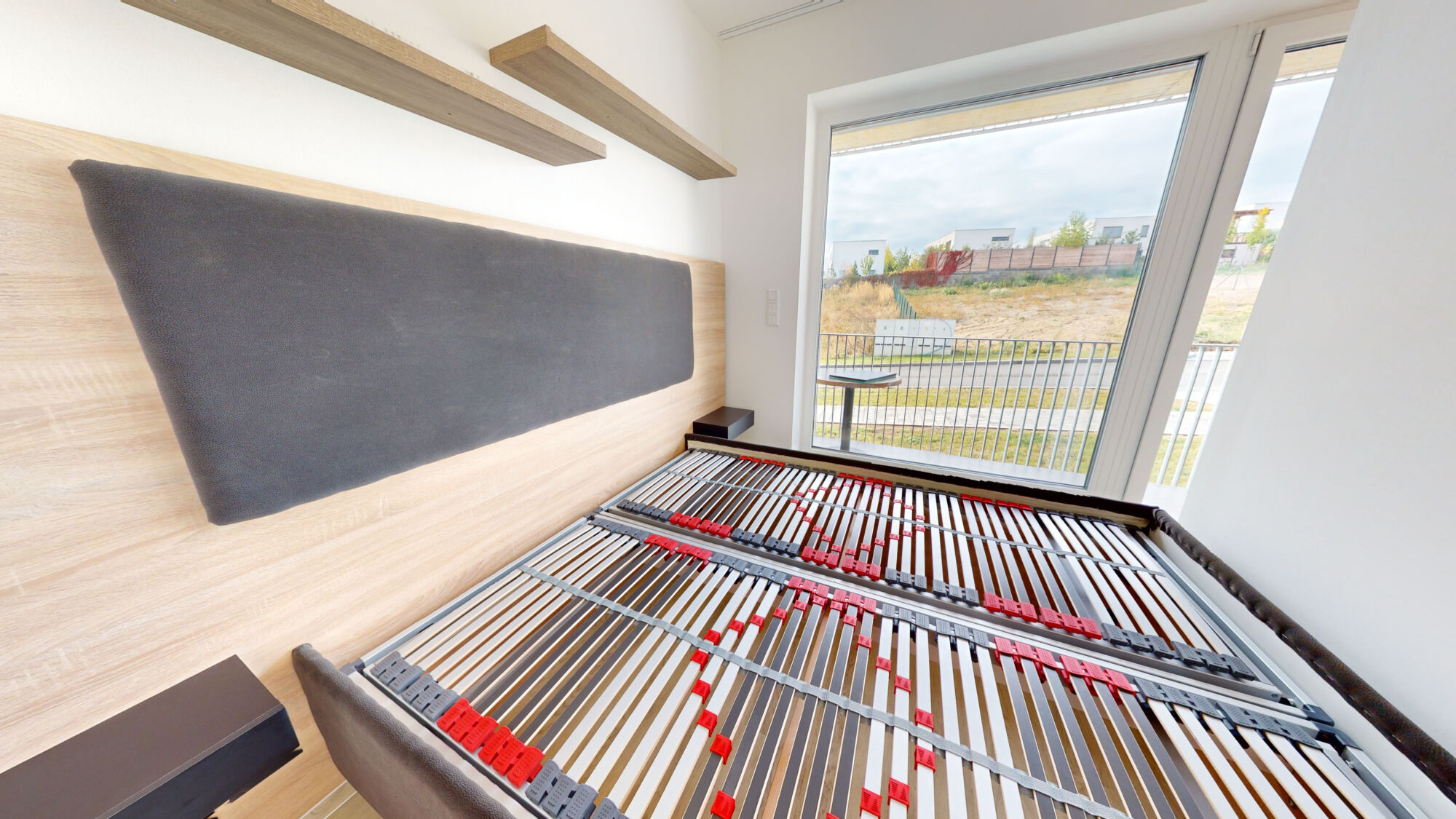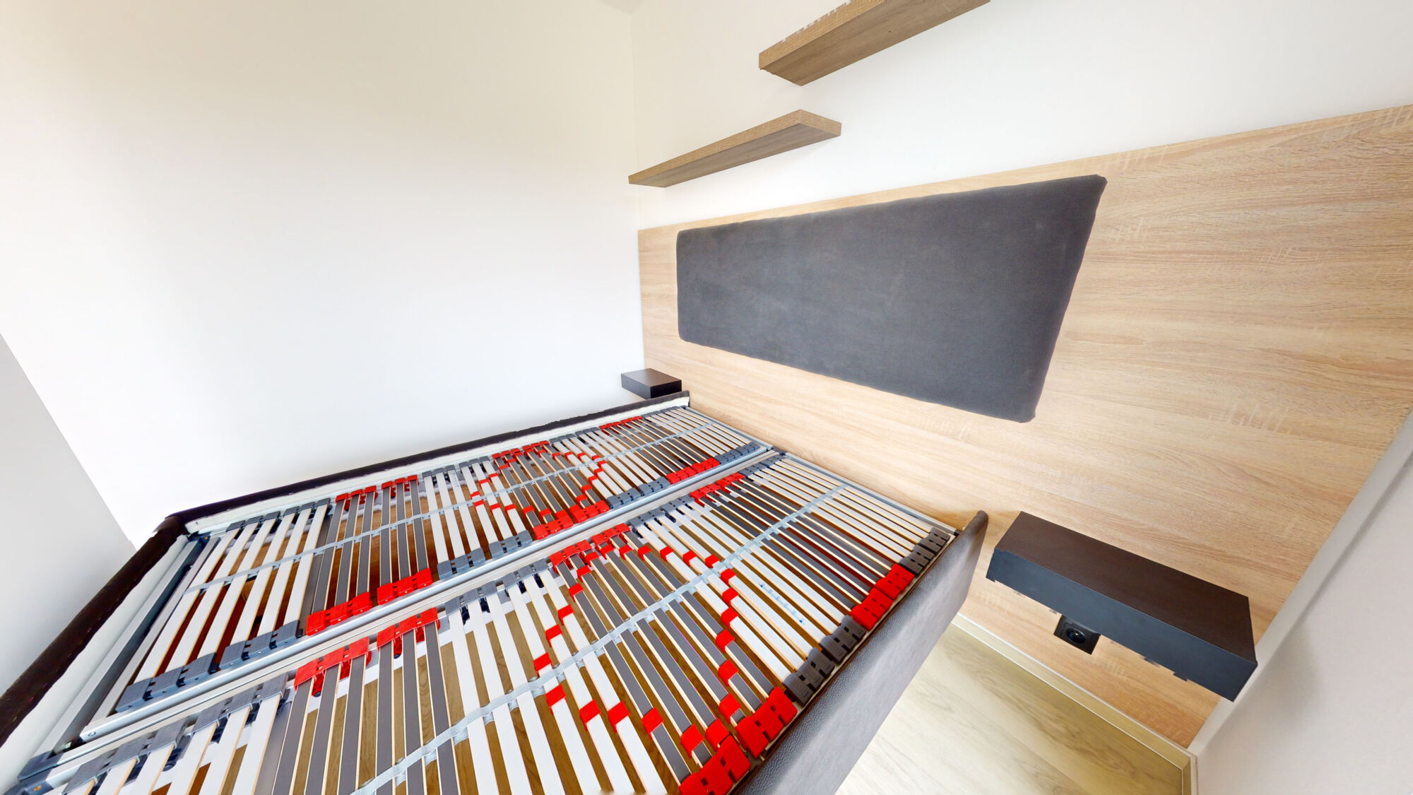 Hlavní místností bytu je prostorný obývací pokoj s pěknou kuchyní, místem pro jídelní kout a odděleným místem na manželskou postel, která je bez matrace součástí pronájmu bytu. To vše přímo propojeno s balkonem. Na všech oknech jsou instalovány předokenní žaluzie s možností naklápění, s elektrickým pohonem.